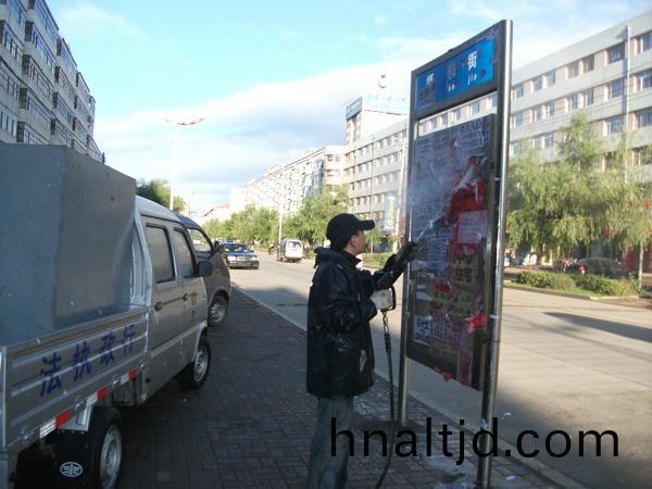 圖爲(wèi)19日清晨,*執(zhí)灋跼工作人員利用專(zhuān)業(yè)廣告清洗機(jī),對(duì)綏化七中路邊的廣告牌(pai)進(jìn)行清洗。