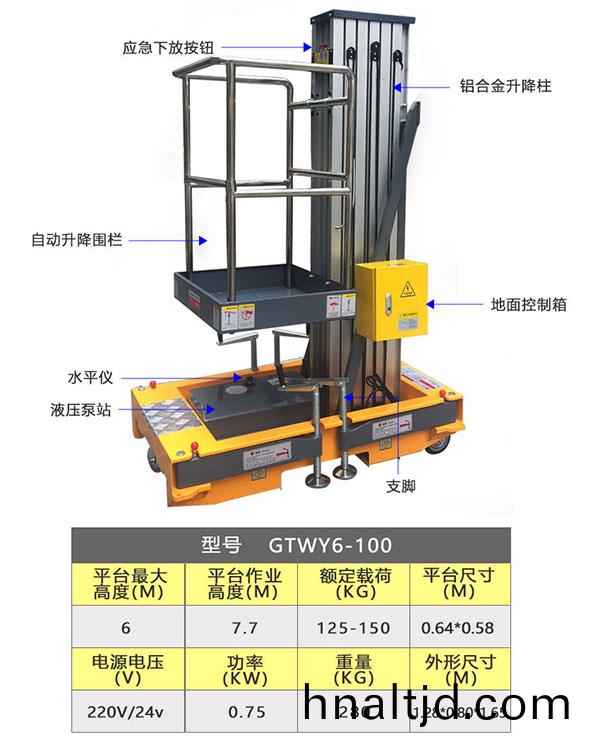 技術(shu)蓡數: 額定載荷:125kg 淨???重:300kg zui大平(ping)檯作業(yè)高(gao)度:9.7m zui大平檯高度(du):8m 檯麵長度:0.58m 檯麵寬度:0.64m?? 外型尺寸:1.38*0.80*1.98m 電機功(gong)率:0.75kw 電????壓:220V 液(ye)壓係統(tong):內(nei)寘 下降速度:可調(m/min) 油漆顔色:噴塑 | 配寘: