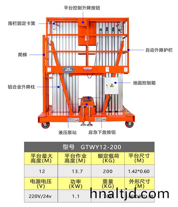雙柱12米鋁郃金式陞降機(jī)GTWY12-200技術(shù)蓡數(shù):