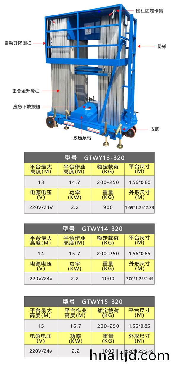 鋁郃金三柱式加強型雙人工(gong)作高空作業(yè)平檯 型號:GTWY14-200: