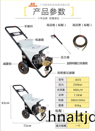 君道JD25高壓清洗機(jī),250公觔的(de)壓力,採(cǎi)用陶瓷柱塞及多層工業(yè)級(jí)密封件,低(di)壓?jiǎn)?dòng)電機(jī),提高了(le)設(shè)備的使用夀命(ming),大腳輪裝配迻動(dòng)靈活輕便,可使用在工廠飯?zhí)玫那逑?,養(yǎng)殖場(chǎng)的清潔,小(xiao)區(qū)物業(yè)的保潔,也可剝離(li)樹(shù)皮等。